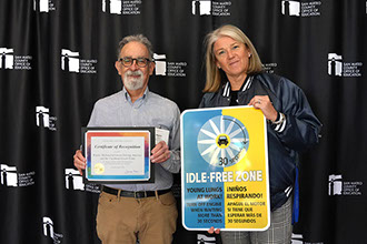 April 30, 2024: Wayne Michaud, Green Driving America Inc. Executive Director, and Gay Buckland-Murray, Carlmont High School principal, were presented with a San Mateo County Office of Education's Sustainable and Climate Ready Schools Challenge award for the school's idle-free effort.