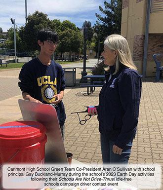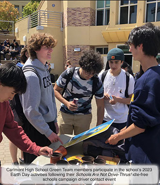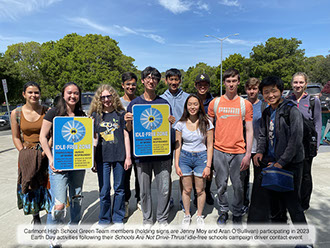 [Re: idle-free school study/campaign at Carlmont High School, 2022-2023 school year] "I am so proud of the Carlmont Green Team for their work with Green Driving America. The Green Team is a 100% student organized and student led club on our campus. The students took the initiative last year to work with Green Driving America on the Idle Free Zone campaign. The students did action research and counted cars at drop off and pick up that sit on our campus in idle. Thanks to their efforts, we were able to publish some data out to our campus community about the impact of idling in cars while waiting. We now have two Idle Free Zones on campus. In addition, their work with Green Driving America in general, and with Idle Free Zones in particular, laid the groundwork for the Green Team to explore other community focused organizations to improve the environmental sustainability of our campus. We are currently working with another non-profit on building more green spaces on campus, that serve pollinators, and even that produce herbs, fruits and greens to donate to local community pantries."