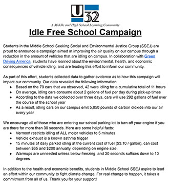 Step 3: school supports idle-free campaign in the U-32 Middle & High School Newsletter, 12/5: