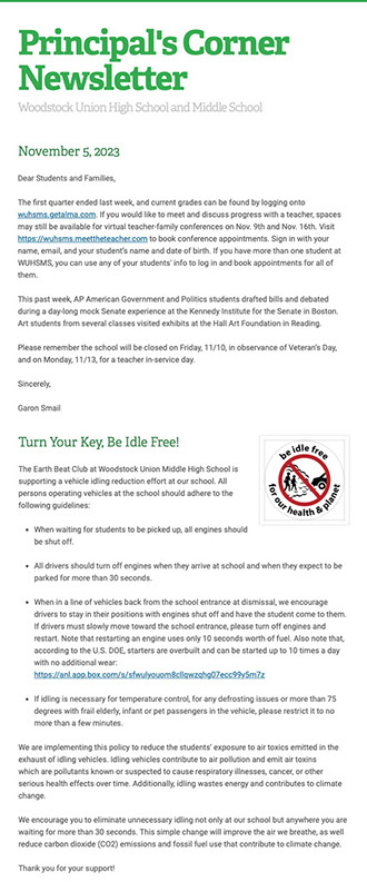 Step 3: school supports idle-free campaign: Principal's Corner Newsletter - 11/5