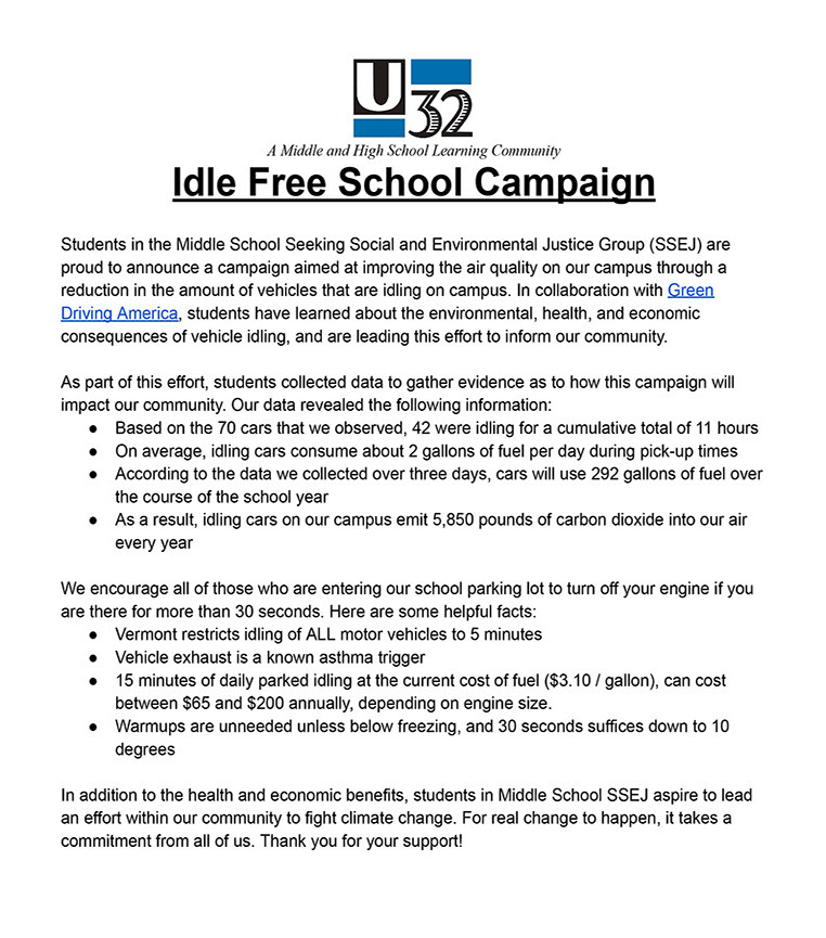 Step 3: school supports idle-free campaign in the U-32 Middle & High School Newsletter, 12/5: