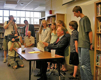 Vermont Gov. Jim Douglas signing ceremony at Browns River Middle School in Jericho, VT, 2007 re enactment of school bus idling rule.