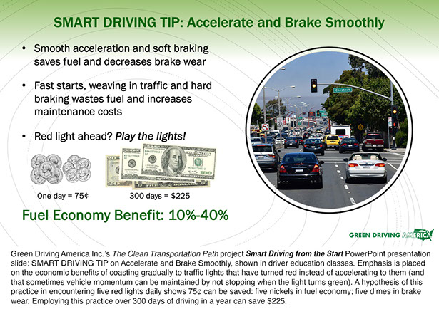 Among our smart driving tips, ACCELERATE AND BRAKING SMOOTHLY and WATCH YOUR SPEED especially show students the benefits of efficient driving that can save them more than $200 annually in fuel use, maintenance, and repair costs while making them safer drivers - a WIN-WIN!