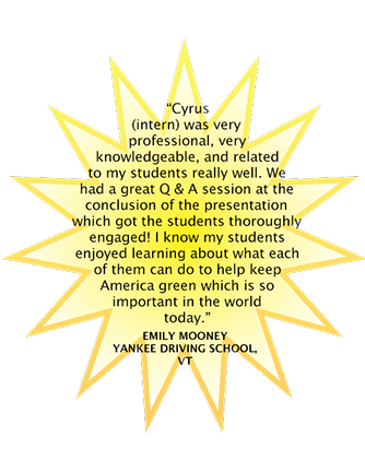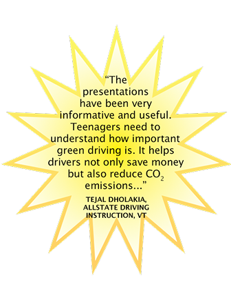 WHAT WILL THE DIFFERENCE BE?: Our educational sessions will make a difference as a percentage of students will grasp and apply the compelling information shown. They (and by extension, some of the adults around them) will learn to be more efficient and environmentally responsible drivers as well as being shown the path to cleaner vehicles. As the existing fleet of internal combustion engine vehicles continue to predominate for the next 15 years or more, the Driving More Efficiently figures at fueleconomy.gov show that each of these smart drivers will avoid the consumption of many hundreds to thousands of gallons of fuel, which will also result in significant reductions of CO2 emissions and energy savings.